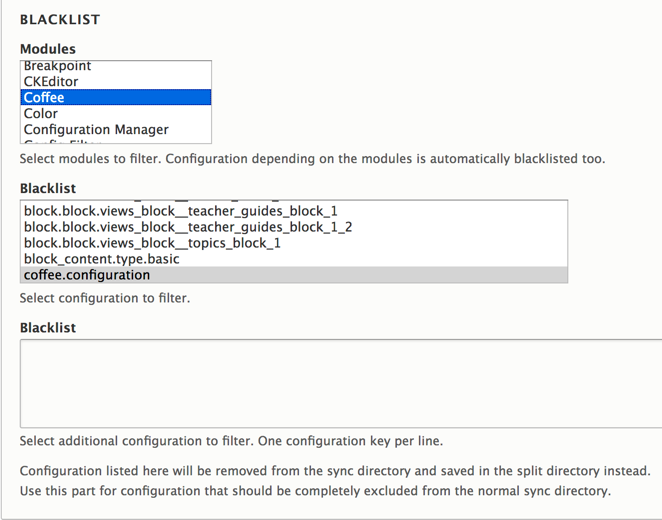 This module was somewhat difficult for me to get my head around at first, because of the definition of “blacklist” given, “Configuration listed here will be removed from the sync directory and saved in the split directory instead.” I read that “graylisting” is somewhat unpredictable, so I won’t cover it here. I would guess that graylisting is for a module that was always installed on all environments, but whose configuration might differ from environment to environment. The canonical version is stored in the main config, and overrides are stored in different environments.